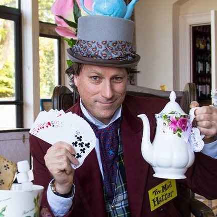 The Mad Hatter close-up character magician. Alice in Wonderland themed mix and mingle or walkabout entertainers for Easter, literary events or any fun Wonderland themed party, venue or event across England and Wales including London, Birmingham, Cardiff, Swindon, Chippenham, Reading, Surrey, Wiltshire, Bristol, Bath, Cheltenham, Somerset and Avon, Swansea, South Wales, Powys, Devon, Taunton, Exeter, Plymouth, Basildon, Gloucester, Brecon, Newport, the Vale of Galmorgan, Manchester, Oxford, Stroud or further afield. |